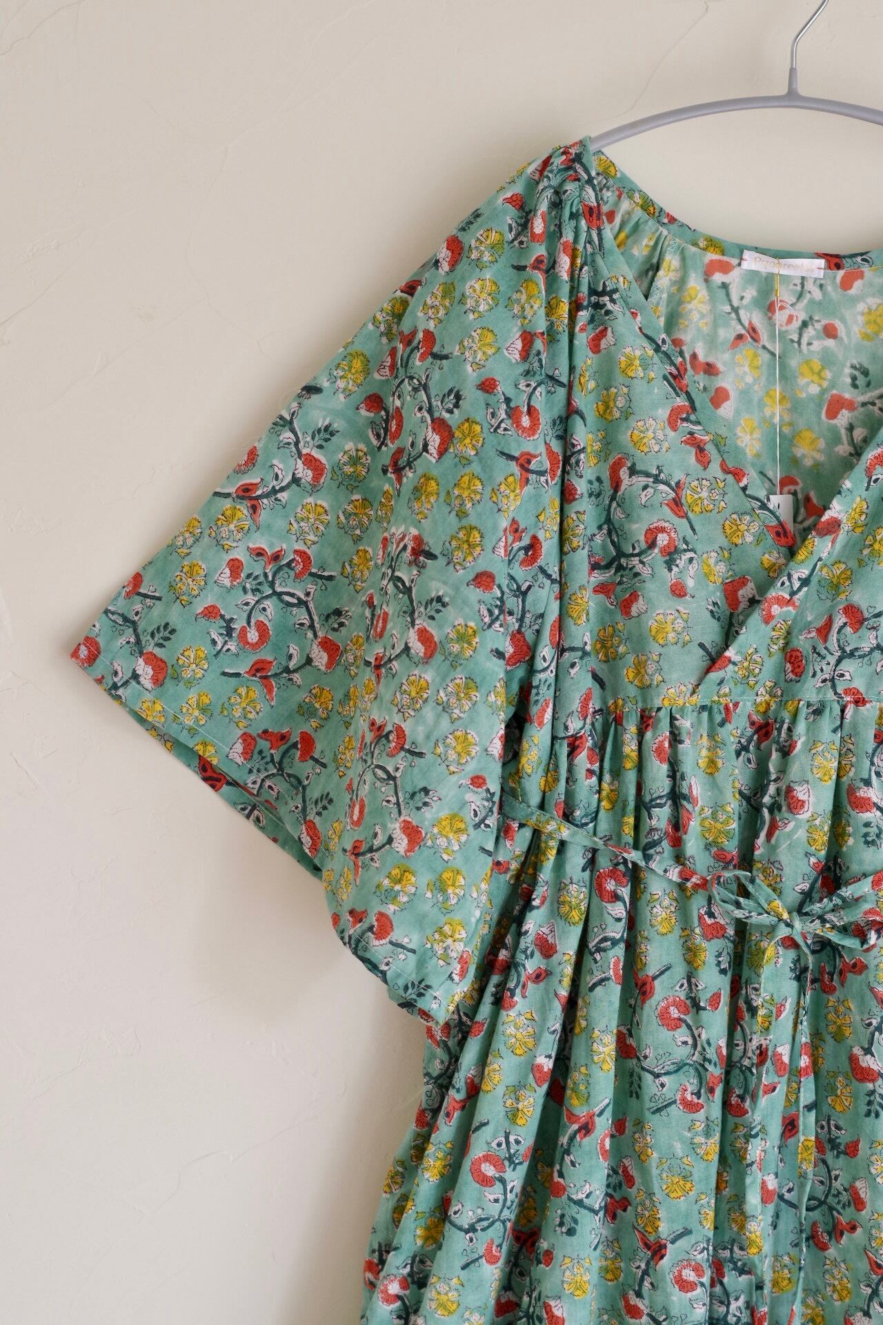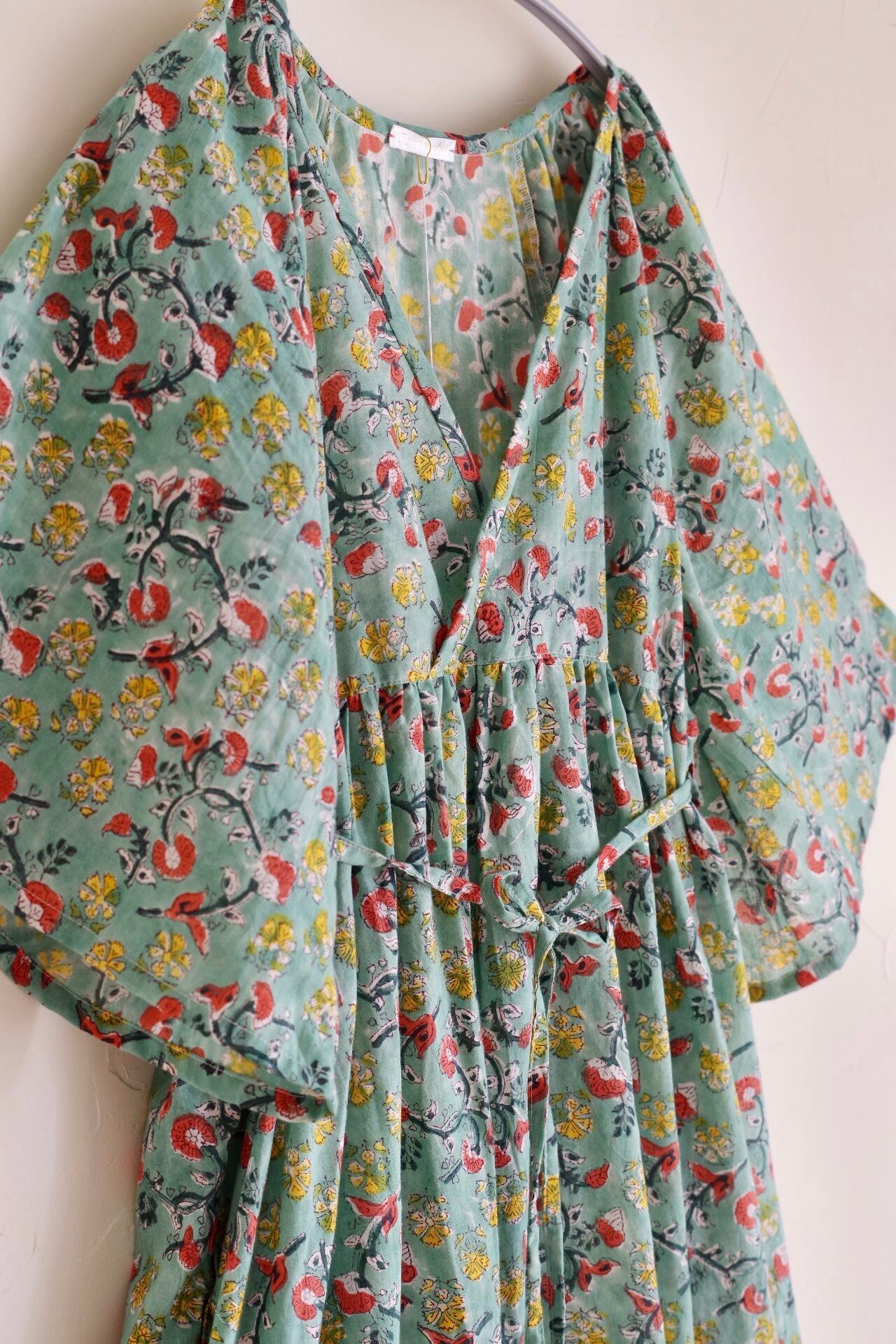 【pyaareetoi】五分袖カシュクール風ワンピース〈ハンドブロックプリント〉
